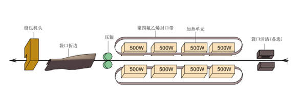 全自動編織袋熱封縫合機作業流程:袋口清潔(備選)→內袋熱封(4組加熱塊加熱:聚四氟乙烯封口帶使加熱塊與袋子不直接接觸,以保護袋子外表不與加熱塊粘連)→壓輥壓合→袋口折邊→縫包機:外袋縫紉。
